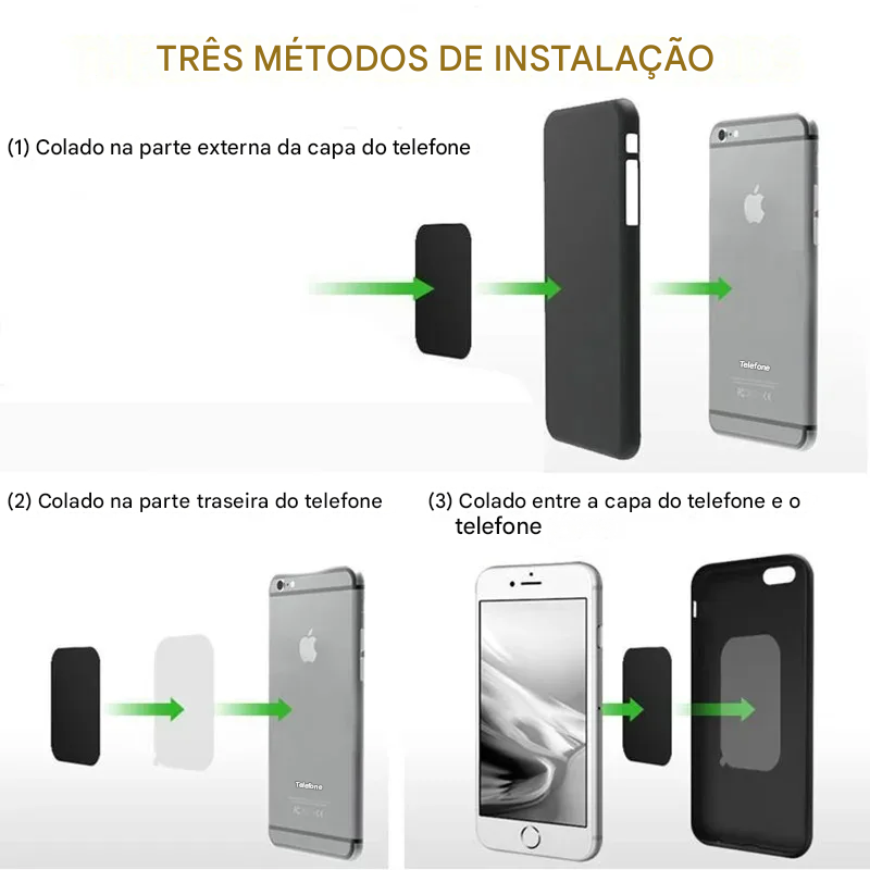 A instalação é extremamente simples: basta remover o adesivo e fixar a placa na parte traseira do celular ou da capa. Em poucos segundos, seu aparelho estará pronto para ser utilizado com suportes magnéticos, sem complicações ou necessidade de ferramentas 🔧✨. Além disso, o design fino e discreto não interfere na estética do dispositivo nem adiciona volume desnecessário.
